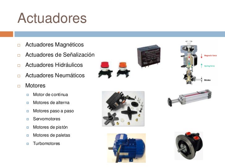 Los actuadores son dispositivos capaces de generar una fuerza a partir de líquidos, de energía eléctrica y gaseosa. El actuador recibe la orden de un regulador o controlador y da una salida necesaria para activar a un elemento final de control como lo son las válvulas.